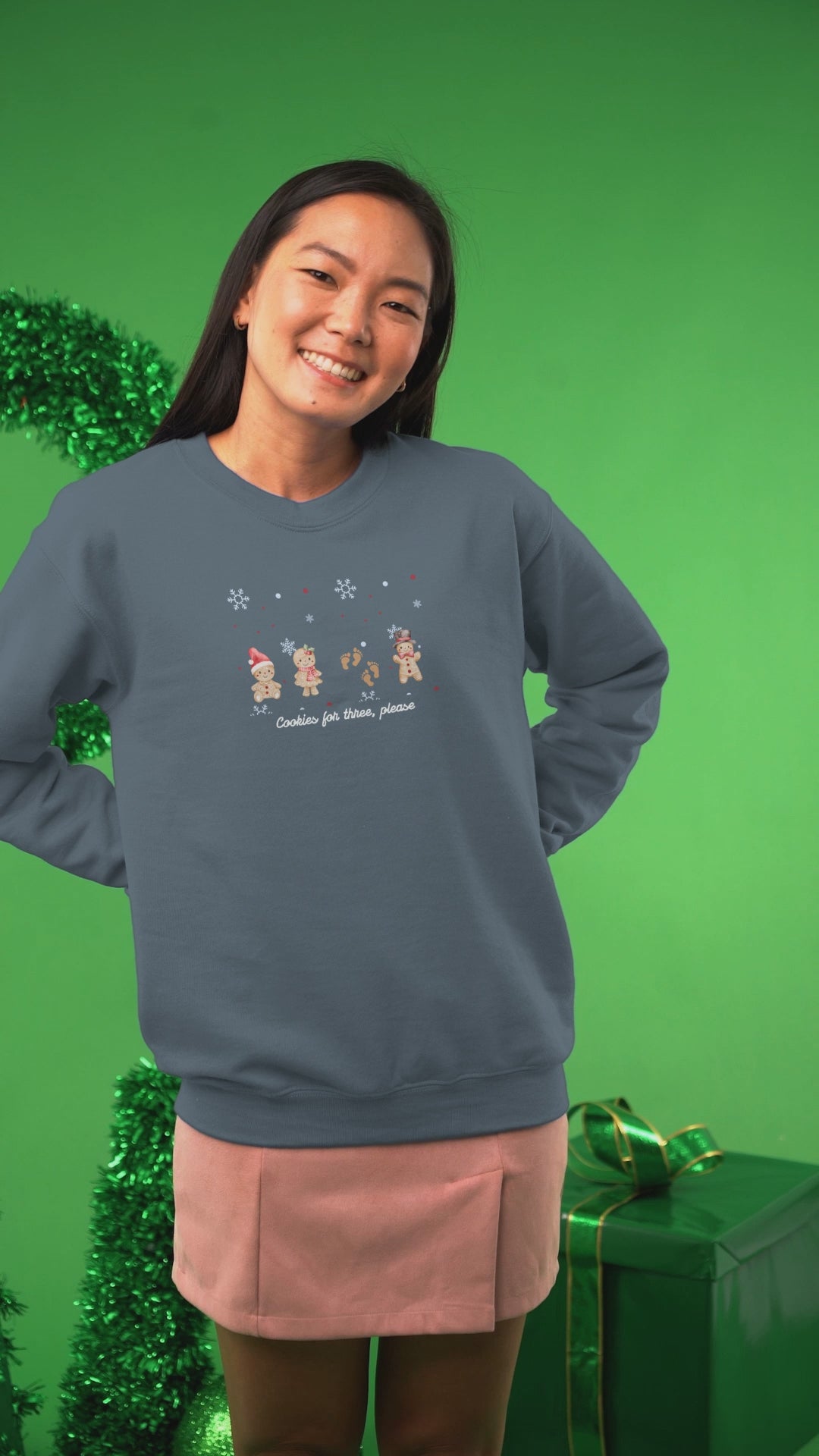 This cozy Unisex Heavy Blend Crewneck Sweatshirt is the perfect way to announce your pregnancy during the holiday season. With the cute message "Cookies For Three, Please" , this sweatshirt is a cute way to surprise your family and friends and share the joyful message on this Christmas Season.