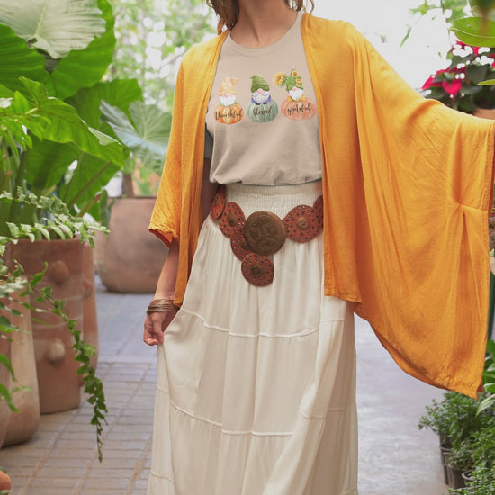 This Thanksgiving T-shirt featuring gnomes is the perfect shirt for fall vibes. Perfect for Thanksgiving celebrations and as a cozy everyday wear for those looking for a comfortable and festive top.