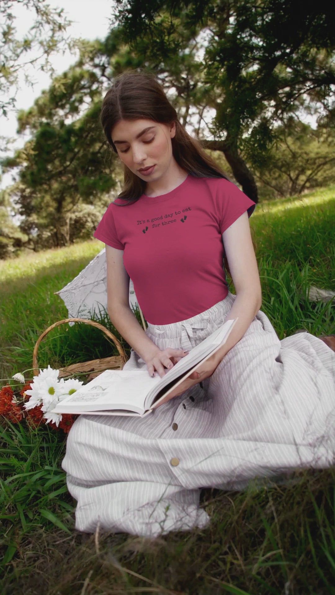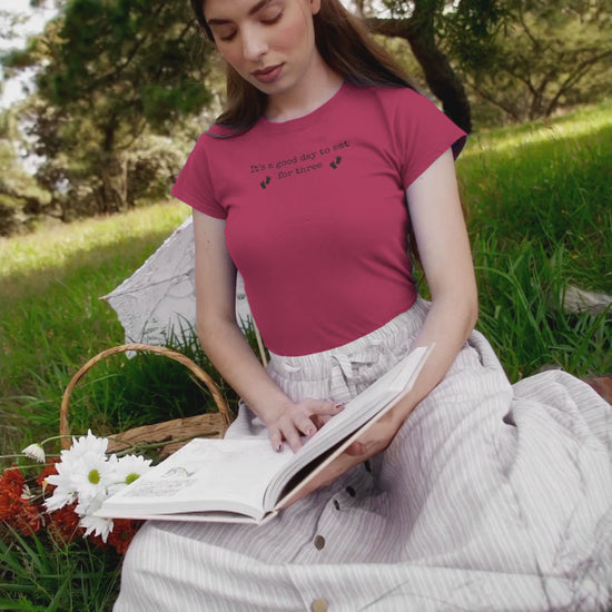 Celebrate the joy of pregnancy with these 'It's a good day to eat for three' pregnancy announcement T-shirts. Perfect for baby showers and announcing the arrival of a little one. The relaxed fit and soft fabric make it comfortable to wear throughout the day. Ideal for expectant parents and those looking for a fun way to share their news.