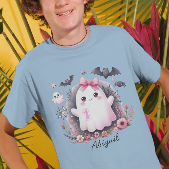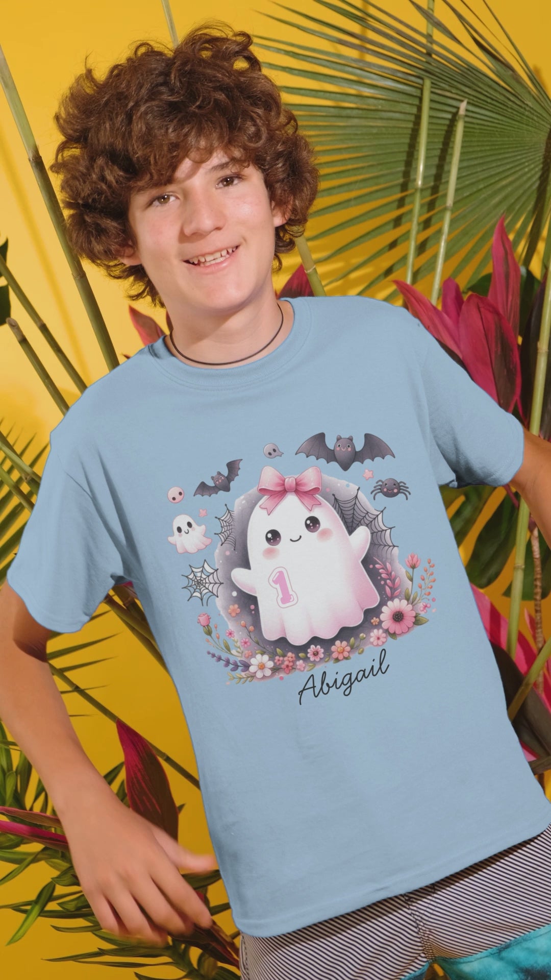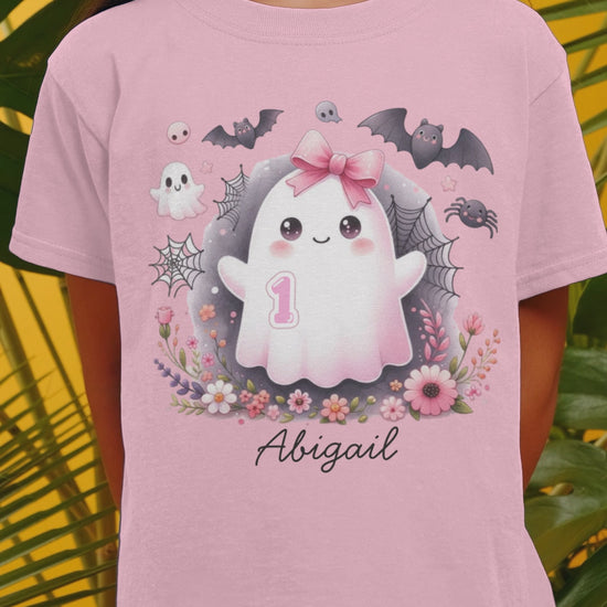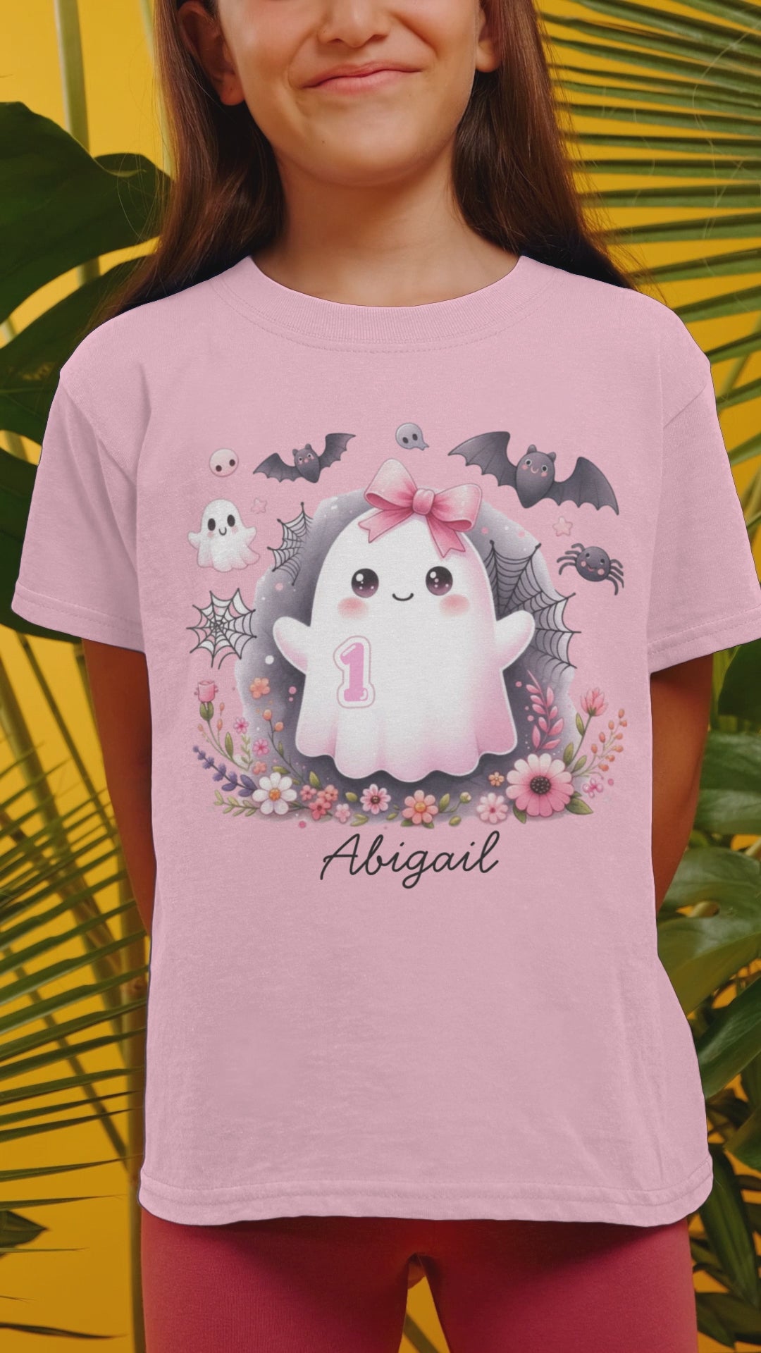 Personalized birthday cute ghost tee for kids, perfect for a coquette and Halloween theme. This tee gives off a playful and fun vibe, suitable for little ones celebrating birthdays or Halloween festivities. Ideal for parents looking for a unique and festive outfit for their child.
