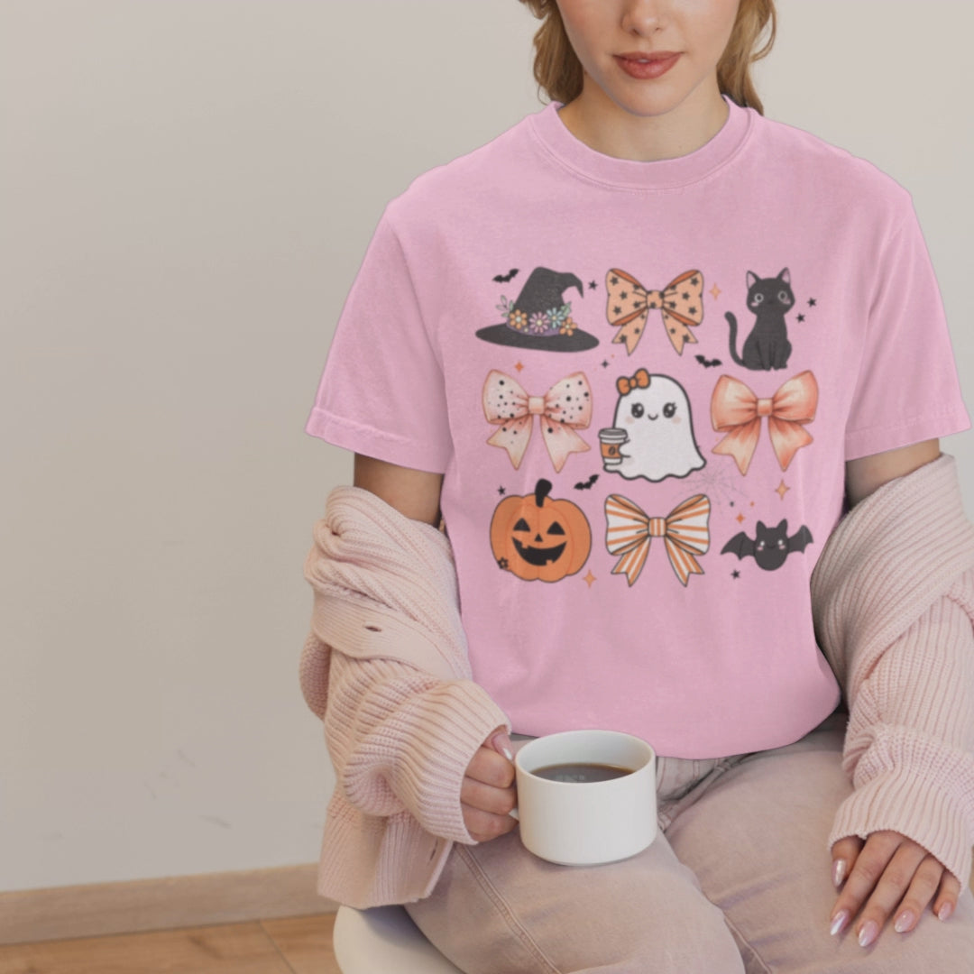 This unisex garment-dyed T-shirt features a Halloween spooky design with pink girly bows, perfect for the fall season. It exudes a cute and coquette vibe, making it a great Halloween gift for those who love a touch of orange in their spooky wardrobe. Ideal for Halloween celebrations and fans of all things girly and ghostly.