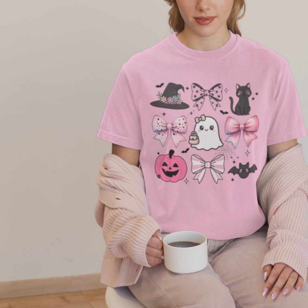 This unisex garment-dyed T-shirt features a Halloween spooky design with pink girly bows, perfect for the fall season. It exudes a cute and coquette vibe, making it a great Halloween gift for those who love a touch of pink in their spooky wardrobe. Ideal for Halloween celebrations and fans of all things girly and ghostly.